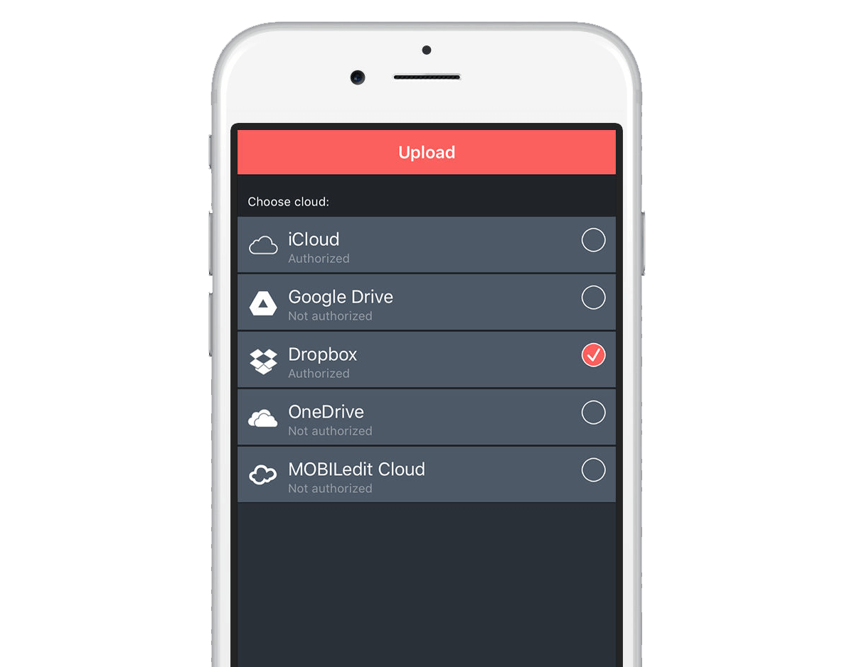 Install the MOBILedit app on your smartphone and transfer data quickly and easily via your favorite cloud service. The mobile app gives you the freedom to connect to your PC via WiFi. You can also quickly create backups to the phone's local storage or to your cloud account such as Dropbox, Google Drive, OneDrive or iCloud. If you're editing or organizing your contacts on the go and something goes wrong, the backup created in your local storage is just a few taps away.