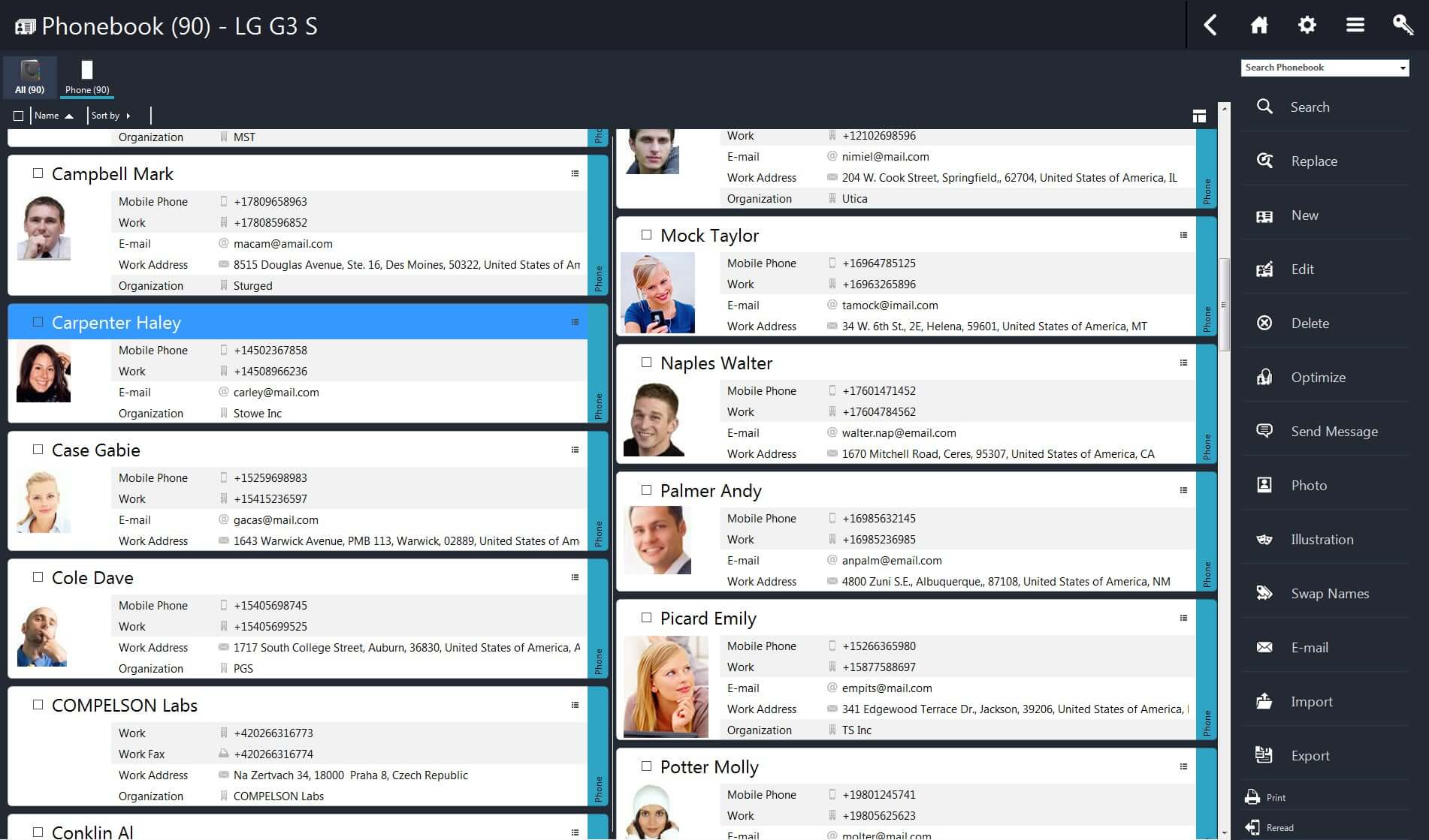 You can edit or delete contacts manually by tapping your phone, but it's annoying and tedious. Imagine a tool that allows you to quickly and conveniently manage your contacts from the comfort of your PC. With MOBILedit you can do a full-text search, choose different views, link or unlink contacts between different accounts (Exchange, Gmail, Facebook, local, etc.), or use the built-in contact optimizer that will remove all your duplicates and intelligently correct many other possible problems with just few clicks.