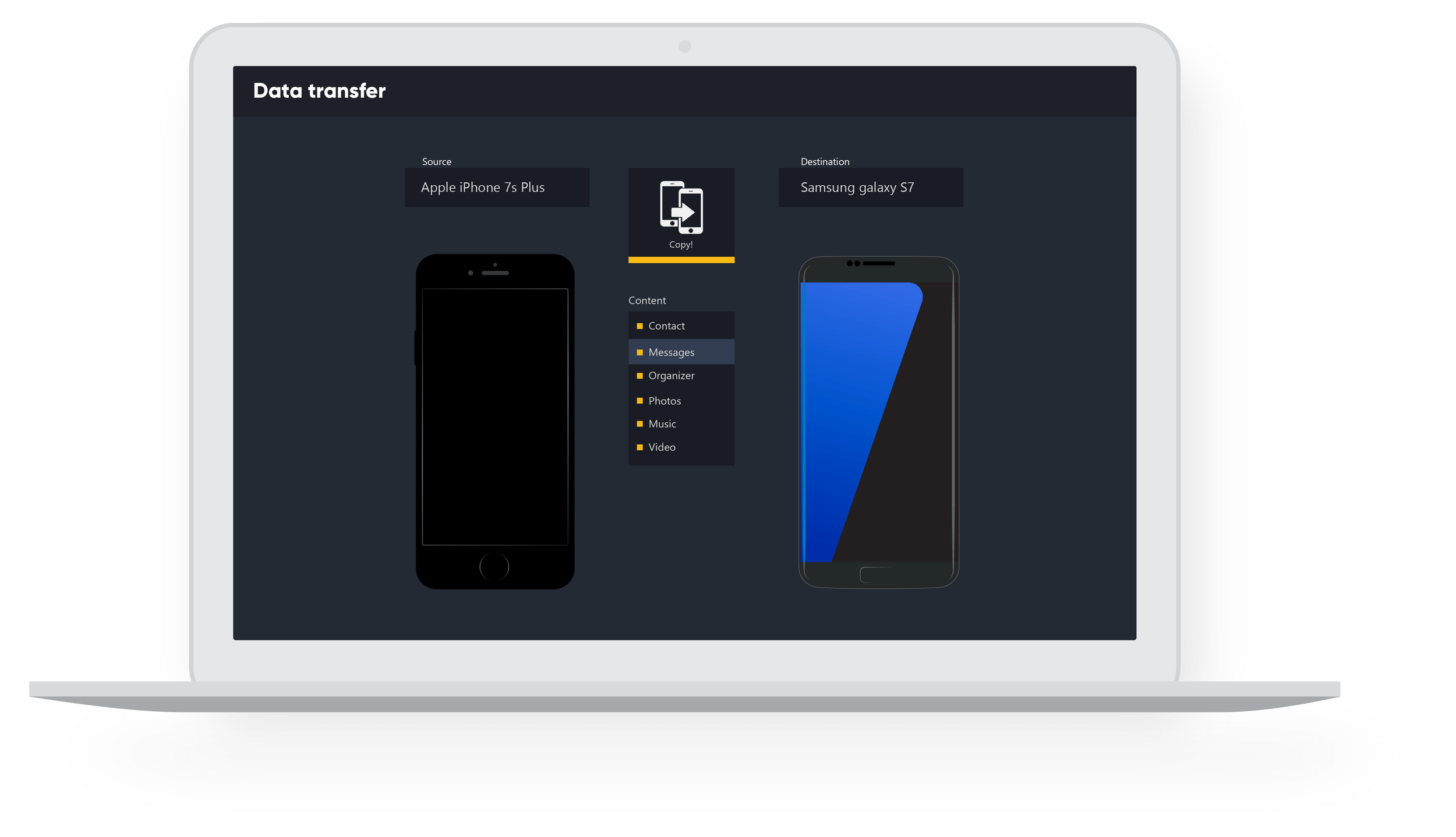 Don't be afraid to upgrade your old phone to the latest model from any manufacturer. With the built-in phone copy feature, copying your phone's content to another device has never been easier. Just select the data you want to transfer and click "Copy". You can copy not only your contacts, but also messages, calendar, photos, music and documents and they will be intelligently placed in the appropriate folders on your new phone. You can migrate contacts and messages directly from our apps .
