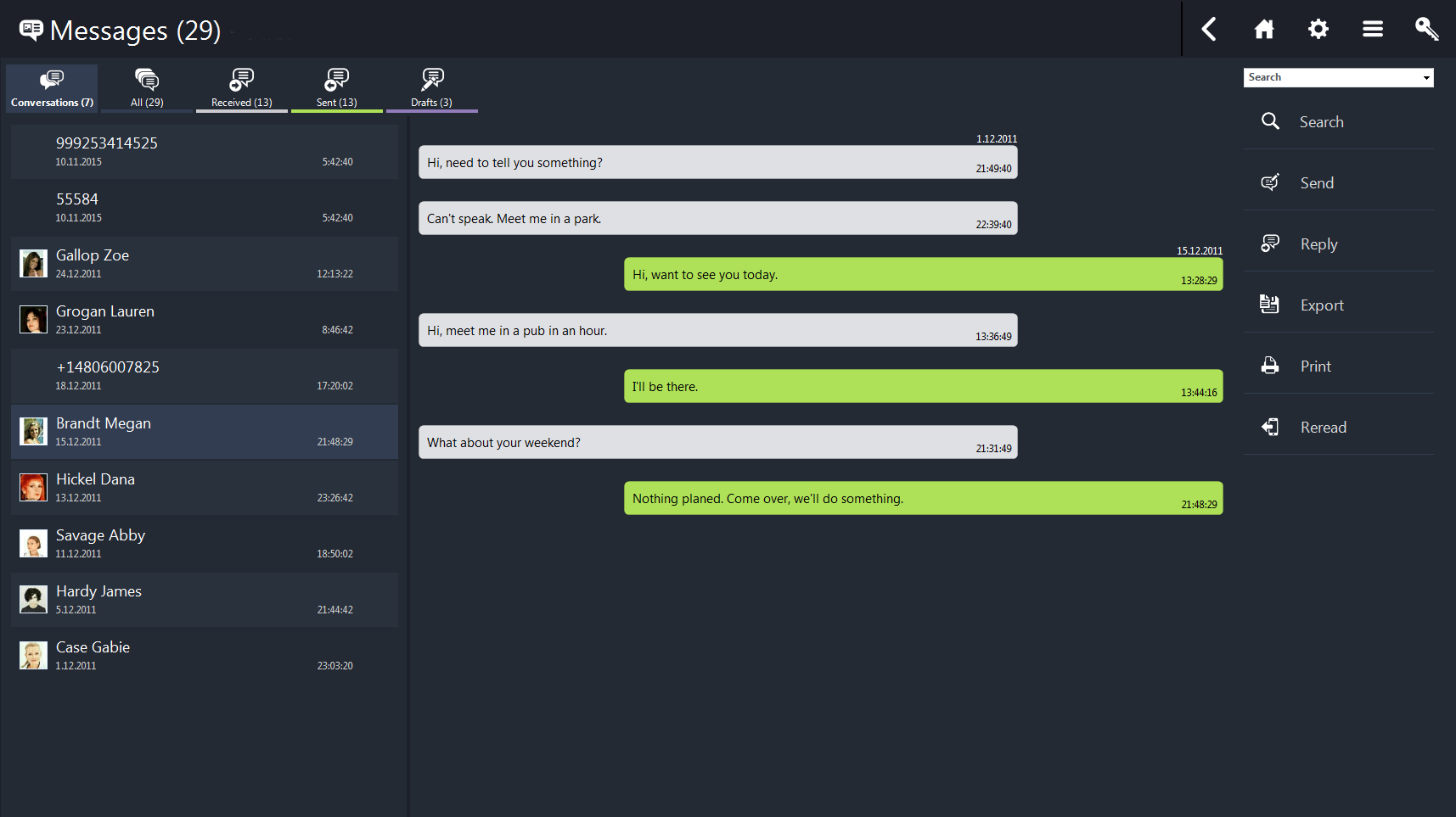 Sending text messages is easy with MOBILedit. Using your computer is a quick and efficient way to send text messages to your friends, especially while you're working in your office and sitting next to your PC. You can even send messages to multiple people, such as a happy holiday message. MOBILedit lets you view your messages in more ways, and with full-text search across all your messages, you can easily find what you're looking for.